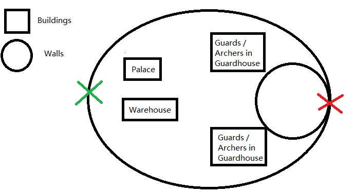 So a possible usage of having the enemy’s defence map, is that you can choose a more strategic point where you want to attack from. See my drawing for an example. Imagine that you chose the red point to attack, you will have an extra wall to destroy and the archers can freely shoot you but if you chose the green point to enter, you can directly attack the palace and kill the emperor. There are probably more usages for the defence map, but I suppose the story might reveal them in the later chapters.